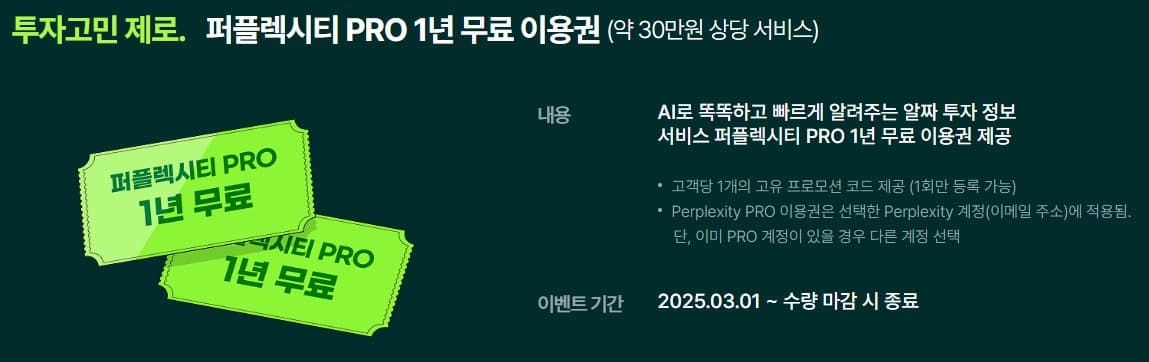 ※ 광고는 아니지만, 현재 나무증권 신규가입자는 Perplexity Pro 1년권을 이벤트로 주고 있으니 참고하세요!