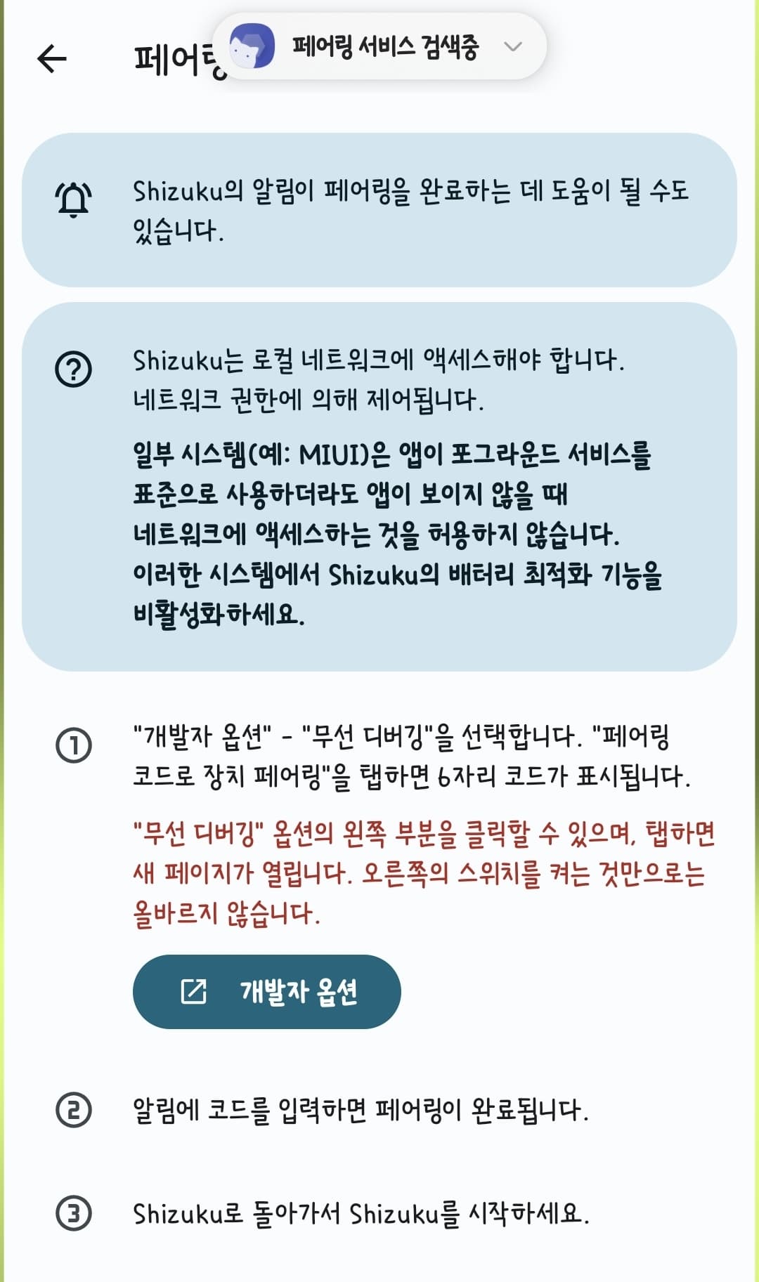 ① 설치된 Shizuku 열어서 [페어링] 클릭해 둠