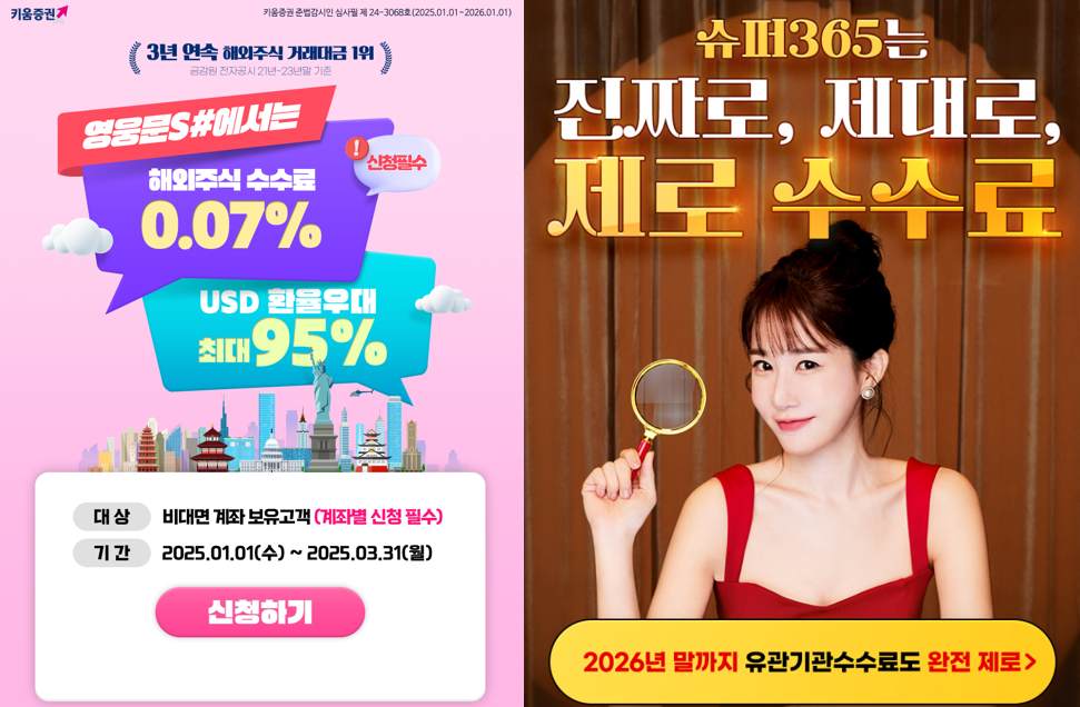 현재 키움증권의 해외 주식 거래 수수료는 신규 가입시 3개월간 0%, 이 후 0.07% 혜택을 제공합니다.